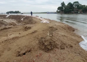 মধ্যে ৪০ হেক্টর ধান কাটা হয়েছে| মধ্যনগরের উপজেলা নির্বাহী কর্মকর্তা সঞ্জয় ঘোষ বলেন, এটি পানি উন্নয়ন বোর্ডের বাঁধ নয়| হামিদপুর গ্রামের সড়ক| নেত্রকোনার দুর্গাপুর হয়ে নেমে আসা পাহাড়ি ঢলে সড়কটি ভেঙেছে| ইকারছই হাওরের বেশিরভাগ জমির ফসল কাটা শেষ| ৫ থেকে ১০ হেক্টরের মত জমির ফসল ডুবেছে| তবে ইউএনও জানান, ভাঙন ঠেকানোর চেষ্টা চলছে|
